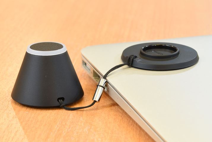 付属のアタッチメント(裏に両面テープ付き)とストラップで、「トレネ」をノートPCに備え付けるとことも可能