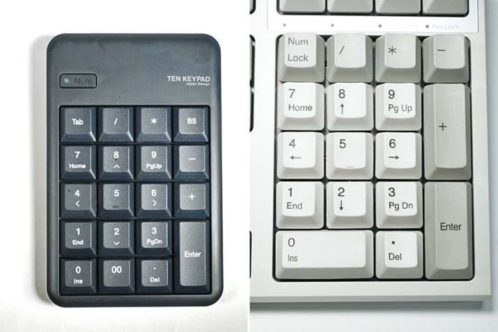 配列はフルキーボードに搭載されているテンキーとは多少異なります。下の画像は左が本モデル、右の画像がフルキーボードのテンキーです。