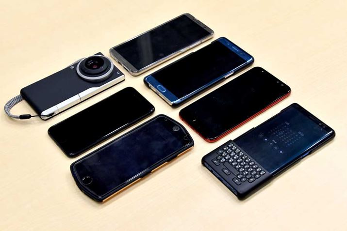 山根さんが当日携帯していた端末の数々。左上から順に「Mate 10 Pro」(ファーウェイ)、「Galaxy Note FE」(サムスン)、「ZenFone 4 Selfie Pro」(ASUS)、「Galaxy Note8(キーボードカバー装着済み)」(サムスン)。左下から「DMC-CM10」(パナソニック)、「iPhone 7」(アップル)、「Meitu M8」(メイツ)