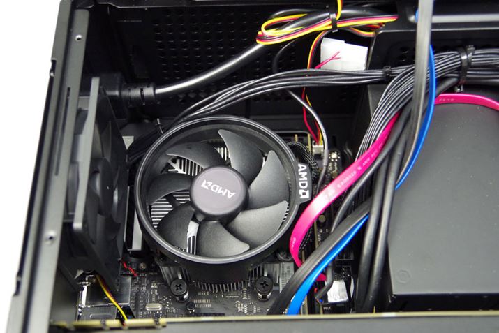 「Ryzen 7(空冷)」モデルのマザーボード面。CPU「AMD Ryzen 7 1700」の上には、ヒートシンク付きのリファレンス空冷ファンが備わる。その他のパーツ構成などは、「Core i7(水冷)」モデルと同じ
