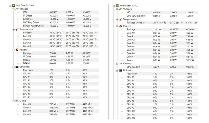 「HWMonitor」によるCPUの電圧、クロック、温度変化(左:「Core i7(水冷)」モデル、右:「Ryzen 7(空冷)」モデル)