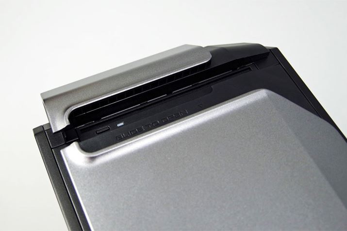 天面カバーは若干スライドする仕様となっており、開けると薄型のDVDスーパーマルチドライブが上向きに備わっているのが見える。使わないときはカバーを閉めておけば、ホコリなども入りづらい