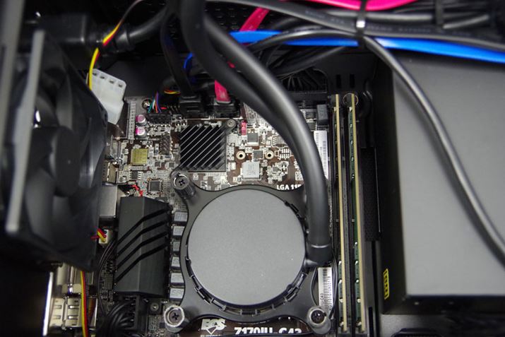 マザーボードを望む。CPU「インテル Core i7-7700K」の上には、熱を吸収するヒートシンクが配置され、その熱を水冷システムによってラジエーターまで循環させ冷却する仕組みだ。メモリーは、高速な「DDR4-2400 DIMM (PC4-19200)」の8GBを2枚挿している。左側に見えるファンは、背面の廃熱ファン