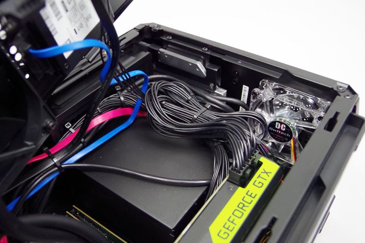 ケース内前面方向を望む。大きく黒い物体が、大容量700W出力のATX電源。「80PLUS GOLD」認証を取得した安定性を誇る。その下側に配置されているのが、前面の吸気ファンだ