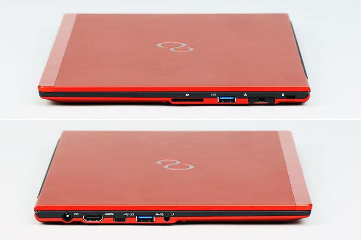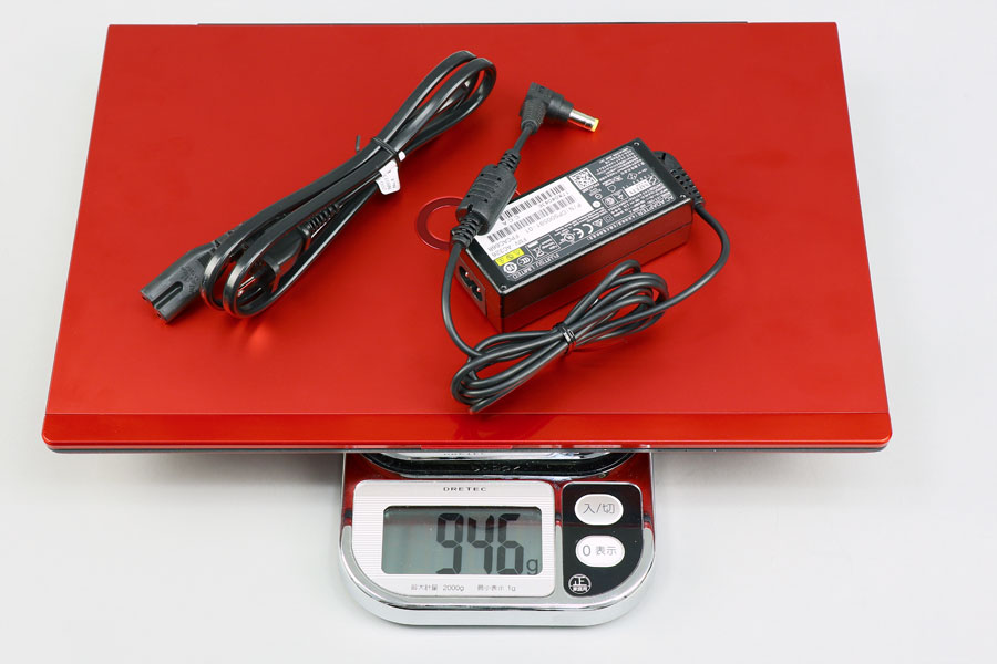 今回は塗装の関係でピクトブラックモデルよりも3gだけ重いサテンレッドモデルを試用したが、実物を手にすると、13.3型のノートパソコンとは思えないほど軽い。ACアダプター込みでも1kgを切っているので、ノートパソコンを毎日持ち歩くという人にはありがたいはずだ。