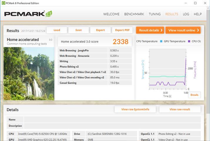 パソコンの総合的な性能を測定するベンチマークソフト「PCMark 8」(Futuremark)のHome acceleratedの結果。スコア自体はそれほど高くはないが、日常使いには十分な性能だ。パフォーマンスを優先すると3541というハイスコアを記録した
