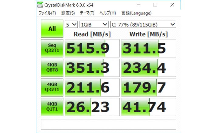 ストレージのデータ転送速度を測定できる「CrystalDiskMark 6.0.0 x64」(ひよひよ氏作)の結果。Serial ATA接続のSSDなので、PCIe接続のSSDよりも遅いが、HDDよりも読み書きは高速。直販モデルではPCIe接続の512GBのSSDを選択できる