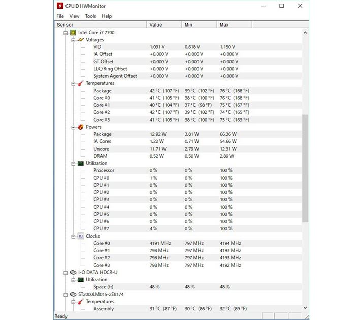 「HWMonitor」で、CPUの電圧、温度などの変化を確認した。「インテル Core i7-7700」(クアッドコア:3.60GHz〜4.20GHz)の状況は、電圧が3.81〜66.36W(平均12.92W)、動作クロックが最大4194MHzで、温度は37〜76℃(平均42℃)という結果。発熱もさほど問題となるレベルではない