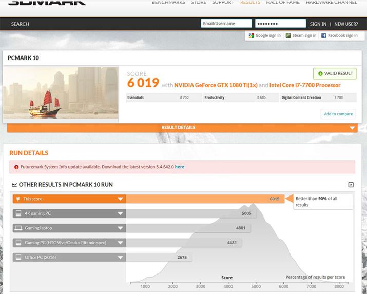 「PC MARK 10」によるベンチマークテスト結果。スコアは「6019」で、かなりの高スコアとなった