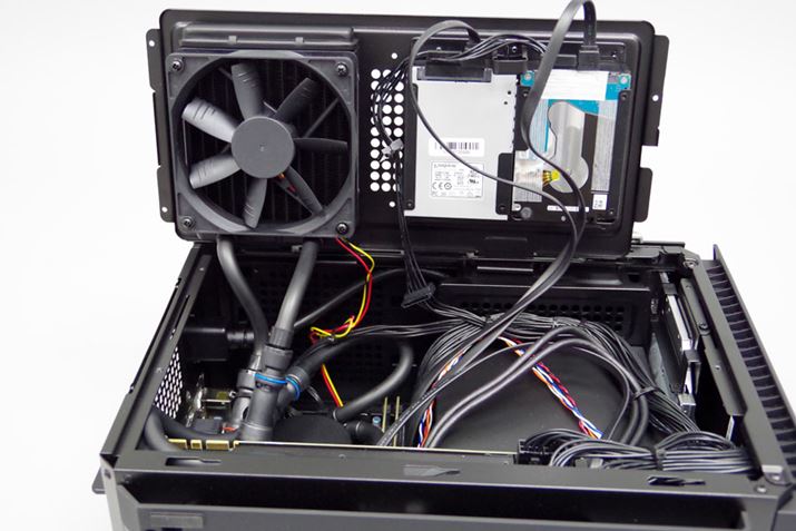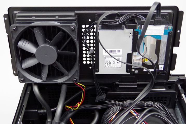 インナーカバーの裏側。水冷用のラジエーターには大型のファンが取り付けられ、強力に冷却をアシストする。右側は、240GB SSD+2GB HDDのデュアルストレージとなる