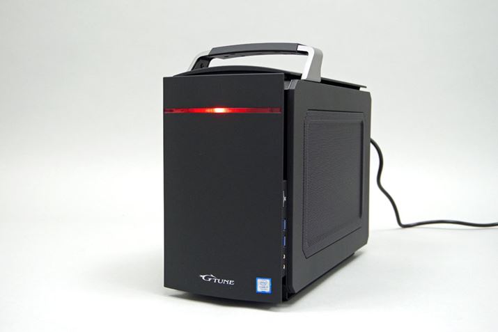 マウスのゲーミングPC「G-Tune LITTLEGEAR i310 シリーズ」のケースを流用。約178(幅)×395(奥行)×330(高さ)mmのコンパクトボディながら、大型のグラフィックボードも搭載可能。上部にはキャリングハンドルが、フロントパネル上部には赤く輝くクリアパネルが設置され、デザイン状のアクセントにもなっている