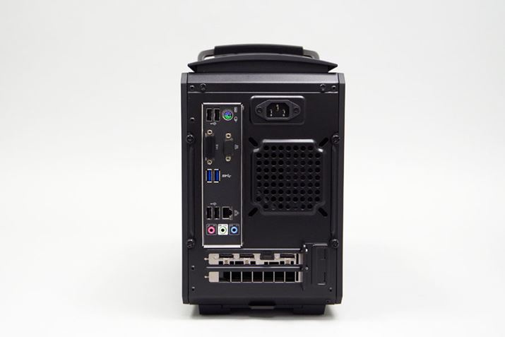 背面インターフェイス。USBポートは計6基(うち2基はUSB 3.0)を装備。その他、ギガビットLANポートや、PS/2マウスポート、アナログオーディオ入出力も備える。グラフィックボードは下部に設置されており、Display PortかHDMIで映像を出力する