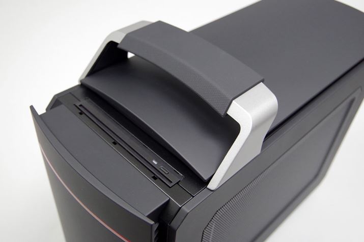 その筐体は全面がブラックで彩られており、いかにもゲーミングPCという風貌を呈している。デザイン上のアクセントになるのは、フロントパネル上部に備えられた赤いクリアパネル。電源を入れると、このパネルが赤く輝き、ユーザーのやる気をやたら盛り上げてくれる。ひと言で言って、カッコいい。微妙にラウンドしたフロントパネルといい、上部に取り付けられたウィング状のキャリングハンドルといい、ほかにはないカッコよさがある。実はこのキャリングハンドル、単にデザイン状のギミックではない。ゲーミングPCの場合、イベントなどで使用されることも多く、デスクトップPCでありながらも持ち運びされる頻度が高い。そこで考えたのが、このキャリングハンドルというわけなのだ。つまりこれは、現場の声から生まれた機能的なデザインなのである。そういうストーリーの端々からも、この筐体の本気度が感じられるではないか。