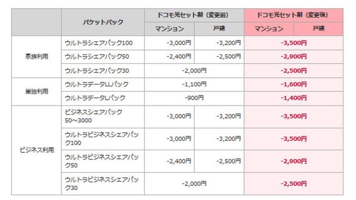 NTTドコモは、光回線「ドコモ光」とセットで適用される割引メニュー「ドコモ光セット割」を2018年2月1日に改定する。改定後 は、家族向け、単独向け、企業向けの大容量通信プラン「ウルトラパック」の割引額が、月額で最大500円拡大される。