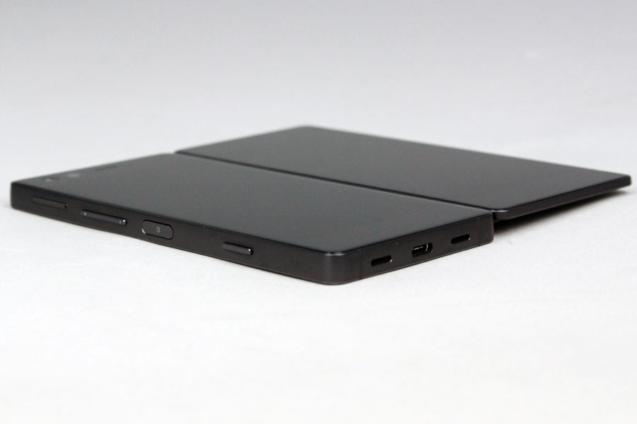 本機のディスプレイはかなりの狭額縁設計だ。そのおかげで、ボディを広げた状態で左右のディスプレイの間にできる隙間は、目測で2mm程度に抑えられている。本機の先祖に当たる元祖折り畳み2画面スマホ「MEDIAS W」では、ベゼル幅がこれよりずっと広く、ディスプレイの一体感はいまひとつだったので、ここには5年分の進化を感じる。