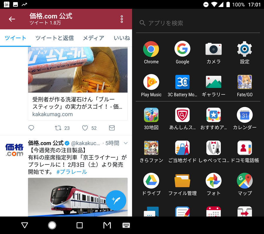 なお、2画面表示の際の情報量は、2160×1920表示となり、現在のハイエンドスマートフォンでは一般的な2560×1440よりも多い。また、ディスプレイの面積は、計算上約144cm2(約74cm2×2面)となるが、これ7インチディスプレイを上回る面積だ。ディスプレイの表示モードは、(1)片面のみ表示、(2)両面に同じものを表示、(3)両面に別のものを表示、(4)両面を1つの画面としてという4パターンから選べる。なかでも両面に別々の内容を表示させる(3)のパターンでは、Android 6.0以降の標準機能“マルチウインドウ”との相性がとてもよい。また(4)の両面をひとつの画面として使う場合だが、一部のアプリで動作が不安定になることもあったが、検証期間中に行われたアップデートで動作の改善したアプリもあった。時間が解決する余地が大きいので、あまり目くじらを立てることはないだろう。