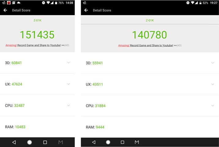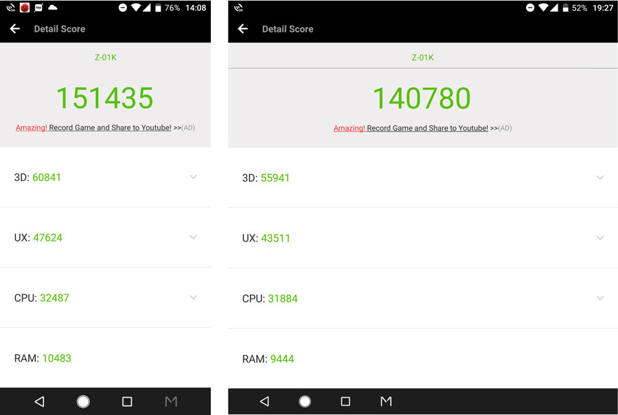 AnTuTuベンチマークのスコア。左が1画面常時の場合、右が2画面表示の場合だ。やはり描画負担の大きい2画面のでは、3DやUXといった描画に関係するスコアが伸び悩んだ