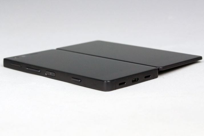 そのボディは、約72(幅)×151(高さ)×12.1(厚さ)mm(折り畳み時)で、重量は約230g。2面の液晶ディスプレイはそれぞれ約5.2インチのサイズで、画面解像度1080×1920のフルHD表示だ。長辺に備わるヒンジを開けば、画面解像度2160×1920の大型画面を備える横幅が約144mmのスマートフォンに変身する。なお、ヒンジの強度に不安感はなく、カッチリ作られているので、強度は安心だ。折り畳んだ状態で厚みが12.1mmもあることに加えて、丸みのないデザインのため、コンパクトとは言いがたいが、これは致し方ないところだ。