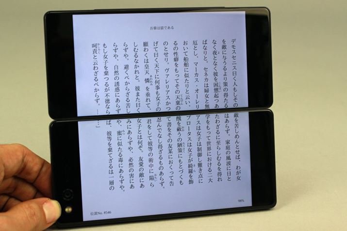 約5.2インチのディスプレイを2面使った表示面積は7インチディスプレイを上回る。アスペクト比はほぼ正方形で、Webサイトはもちろん、電子書籍や雑誌も見やすいうえに、1面をゲームに、もう1面に攻略サイトを表示させるなど、別々の内容を表示させることもできる