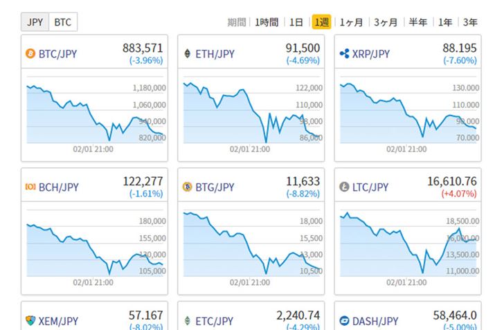 2018年2月5日13時ごろまでの1週間のチャート。各仮想通貨が軒並み下落しており、特に2月1日に急激な下落が際立っている