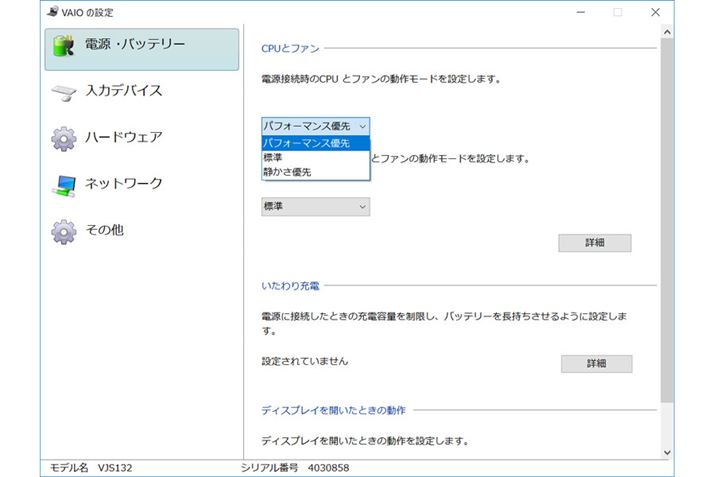 VTPは「VAIOの設定」の「CPUとファン」の動作モードを「パフォーマンス優先」にすると有効になる。VTPを有効にしてベンチマークテストを実施したところ、ファンが高速に回転し、動作音が大きくなった。もちろん、バッテリーの消費も大きくなるので、必要なときだけ有効にするとよさそうだ
