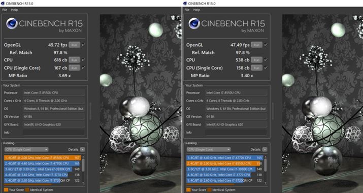 CINEBENCH R15の結果。今回はCore i7-8550Uを搭載したモデルを使用している。左がVTP適用時、右がVTPをオフにした場合。驚くほどの差ではないが、CPU、CPU(シングルコア)ともにスコアがアップしている