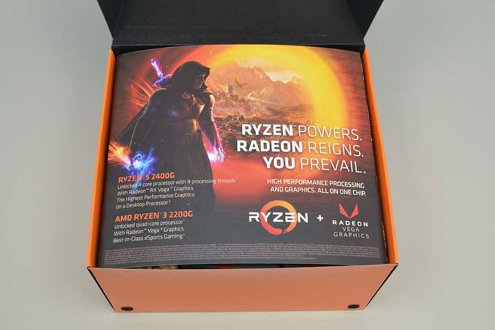 フタをあけたらいきなり屈強な男性キャラクターが描かれたAMDからのメッセージが現れた。デスクトップ版Ryzen APUはゲーミングにも向いているということをアピールしたいのだろう。こういった演出はいかにもAMDらしい