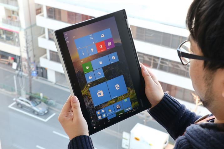 薄型・軽量ボディはタブレットスタイルで利用するときにもありがたい。タブレットスタイルで利用する場合は、キーボードを押しても入力されない仕組みで、誤入力を防げる。360°回転するヒンジは信頼性の高い2軸タイプ。頑丈でガタつかず、スムーズに回転する