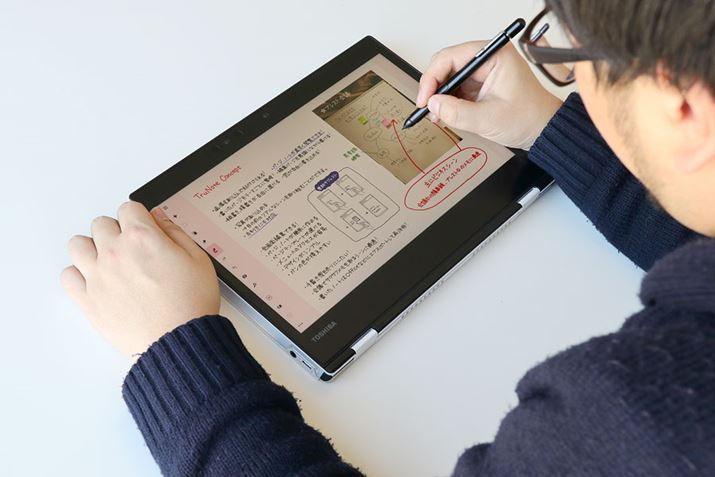 書き心地に定評のあるアクティブ静電結合方式のアクティブ静電ペンが付属するのに加えて、ペン入力に対応した東芝独自のアプリもプリインストールされている。ペン芯が1.0mmと細く、小さな文字も書きやすい