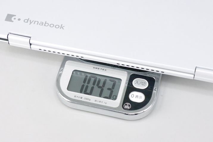 カタログスペックの重量は約1099gだが、実測してみたところ、さらに軽い1043gだった。本体サイズは、約299.0(幅)×219.0(奥行)×15.4(高さ)mm。薄型ボディだがThunderbolt 3対応のUSB Type-Cポートに加え、USB 3.0ポートも備えている