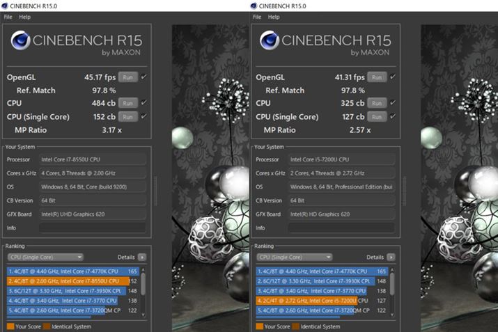 CPU性能を測定する定番ベンチマークプログラム「CINEBENCH R15」の結果。左がクアッドコアの「Core i7-8550U」を搭載する「dynabook VZ82/F」、右がデュアルコアの「Core i5-7200U」を搭載するノートパソコン。デュアルコアとクアッドコアのコア数の違いは大きく、CPU(マルチコア)のスコアは100cb以上の差が出た