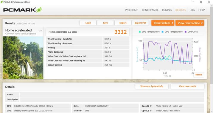 パソコンの総合性能を測定するFuturemarkのベンチマークプログラム「PCMark 8」(Home accelerated)の結果。「3000」以上が出れば高性能なノートパソコンの部類に入るが、「dynabook VZ82/F」は「3312」と「3000」を大きく上回るスコアを記録。16GBのメモリー、1TBの大容量SSDも、スコアを押し上げる大きな要因になっていると思われる