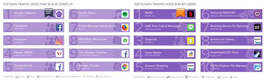 最後はデータ通信量が激しいアプリトップ10(左が起動時に実行されるアプリ、右がユーザーによって起動されるアプリ)。左では、「Facebook」や「インスタグラム」のほか、「Yahoo! JAPAN」が4位にランクインしています。右では、「Netflix」が1位、「LINE」が2位。ストリーミング配信やコミュニケーションアプリが上位にくるのはわかるのですが、メモリー最適化などを行うツール系アプリ「Clean Master」やショッピングアプリの「Amazon Shpping」が上位に入っているのは、少し意外ですね。