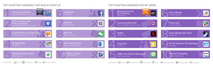 以下のランキングは、左が、起動時に実行されるバッテリー消費の激しいアプリトップ10。右が、ユーザーの使用時にバッテリー消費の激しいアプリトップ10です。注目は、右のランキングに日本で高い人気を誇る「LINE」が5位にランクインしている点です。2つのランキングを見ると、ストリーミングやコミュニケーションアプリが多くなっているのがわかります。
