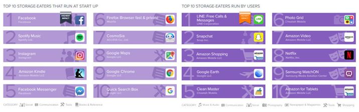ストレージ容量の消費が激しいアプリトップ10(左が起動時に実行されるアプリ、右がユーザーによって起動されるアプリ)