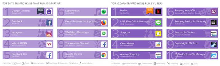 データ通信量が激しいアプリトップ10(左が起動時に実行されるアプリ、右がユーザーによって起動されるアプリ)