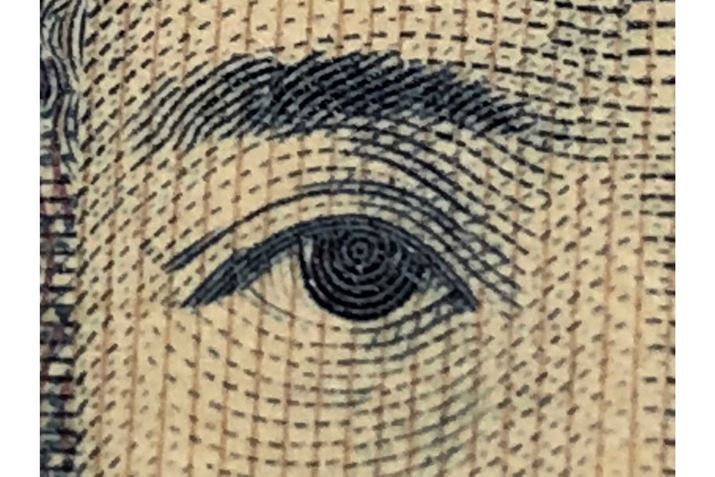 1,000円札の野口英世像の目を撮影。「マクロレンズ」なしのカメラアプリでは、デジタルズーム最大倍率の10倍でも、このあたりの画角が限界