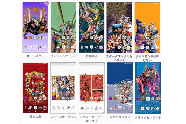 同機は、壁紙やアイコンのデザインが統一された「テーマ」を「JOJOホーム」として10種類搭載。好きな「テーマ」に簡単に一括切り替えできる。ラインアップは次の通り。