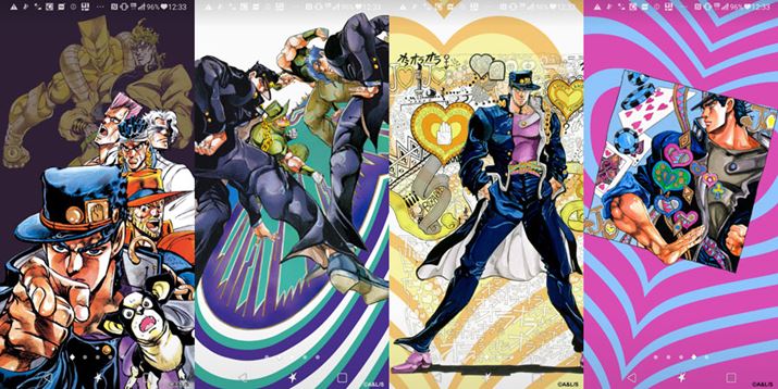 「JOJOホーム」では、画面をめくるたびに異なる壁紙が表示される。さらに、ピンチアウト操作を行うことで、アイコンが消えて壁紙のイラストだけをまるで画集のように鑑賞できる。なお、壁紙のイラストは、もちろん荒木氏の描き下ろしだ!