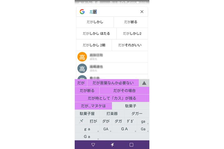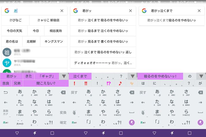 「き」と入力すると、第1候補に「君がッ」が表示される(写真左)。これをタップすると「泣くまで」が(写真中央/Google検索の場合、この時点で全文が候補に出てしまっているが……)、さらにタップすると「殴るのをやめないッ!」が現れる(写真右)