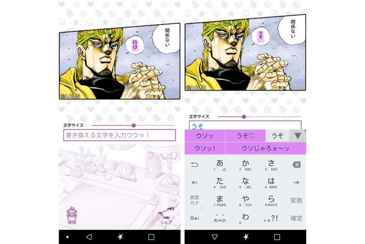 さらに名言・名シーンを楽しみたい人には、自分だけの名シーンが作れるアプリ「JOJOエディター」が用意されている。名シーンのセリフの一部が空欄になっており、コマに自分の好きな言葉を書き込めたり、画像とセリフを組み合わせて、オリジナルのコマを製作したりできる。