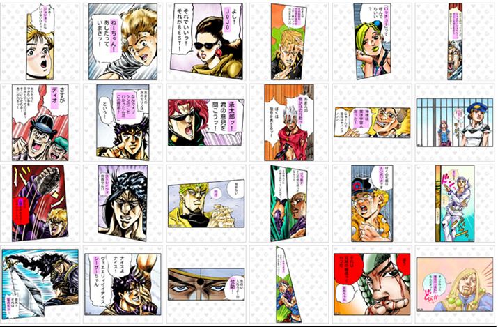 「JOJOエディター」でセリフを編集できるコマの一覧。好きな言葉を入れて、“写真でボケる”みたいな大喜利的な言葉遊びもできる