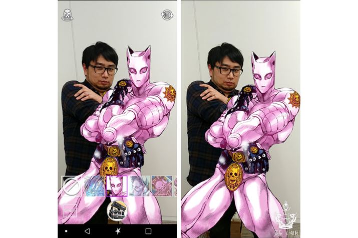 AR撮影モード「スタンドビジョン」では、被写体(人)にカメラを向けると、自動的に「スタンド」(写真のスタンドは「キラークイーン」)が出現(写真左)。スタンドは撮影時に数種類から選べるので、好きなスタンドと一緒に「ジョジョ立ち」して撮りたいところだ。右の写真が実際に撮影した写真で、右下に端末背面に描かれているのと同じイラストが差し込まれる