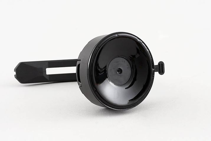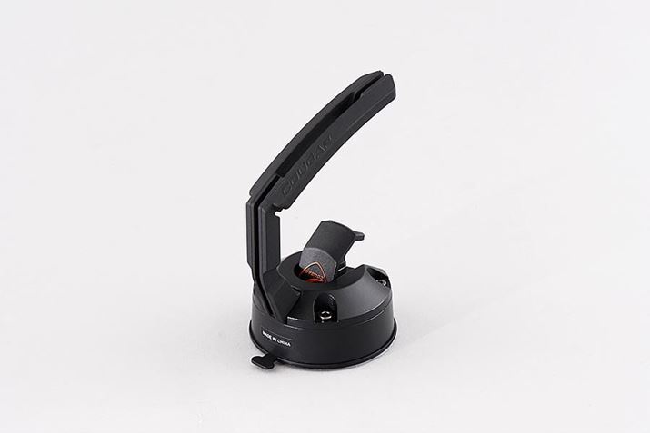 なかでも「BUNKER」はコンパクトなモデルで、本体サイズは110(幅)×115(高さ)mm(台座の円形部は直径70mm)で重量は85g。これだけの小型軽量を可能にしたのは、強力に固定できる、特許取得済みという独自の真空吸着パッドの採用によるもの。見た目は真っ黒い吸盤ですが、普通の吸盤とは異なり内側に強力な粘着力があるのが特徴です。これにより、平らな面はもちろん、メラニン化粧板のようなちょっとザラザラした表面でもガッチリ吸着(天然木などを使った木目は厳しいかもしれません)。一度くっつくとなかなか離しません。