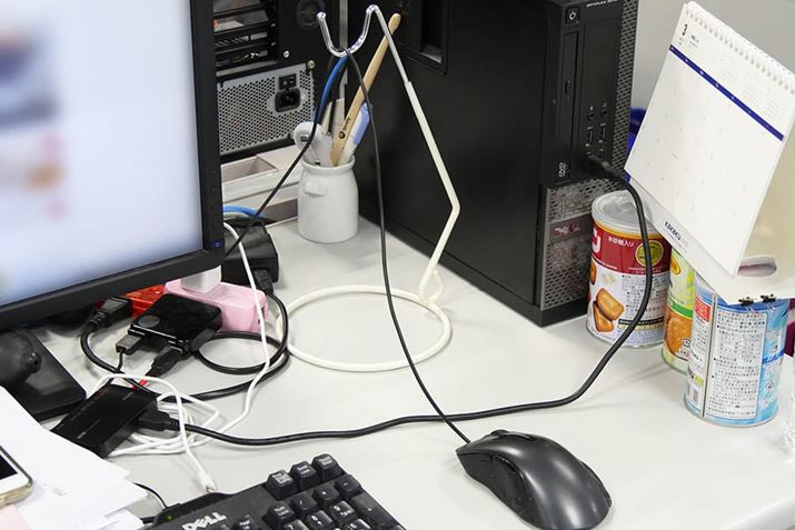 自席の模様。スマートフォンやカメラのバッテリー充電、撮影した画像を取り込むときに使うガードリーダーなどで、机の上はケーブルが這い回っています。こんな環境だとケーブルがからまったりすることも多々あるわけでして……