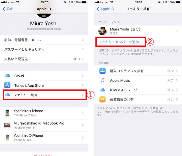 「設定」画面の一番上に表示される自分(親)のアカウント名をタップすると左側の画面が表示されるので、(1)の「ファミリー共有」をタップ。右の画面が表示されたら、(2)の「ファミリーにーメンバーを追加...」をタップする