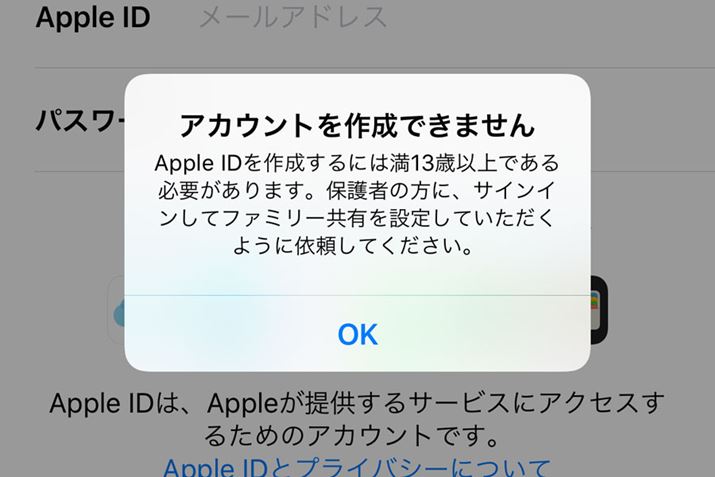 Apple IDを作成する場合、利用者の生年月日を入力する必要があり、13歳未満だとApple ID(アカウント)を作成できない