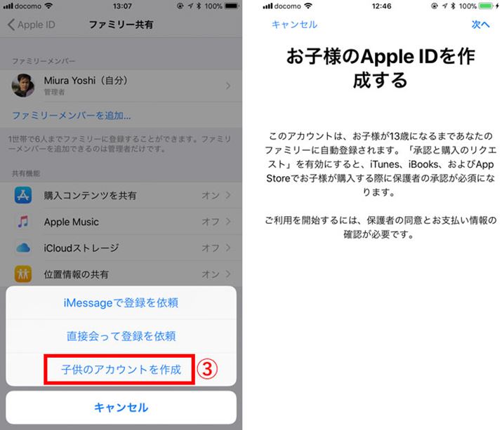 続いて、左の画面が表示されるので、(3)の「子供のアカウントを作成」をタップ。右の画面が表示されたら、右上の「次へ」をタップし、子どもの誕生日、子どもApple ID(アカウント)、秘密の質問の答えなどを入力する