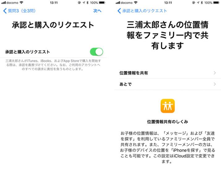 「承認と購入のリクエスト」は初期状態で有効になっている(左)。位置情報を共有しておくと、子どものiPhoneの位置を「iPhoneを探す」という機能で見られる(右)。iPhoneを持っている子どもがどこにいるのかがわかるので、防犯や見守りに活用できる