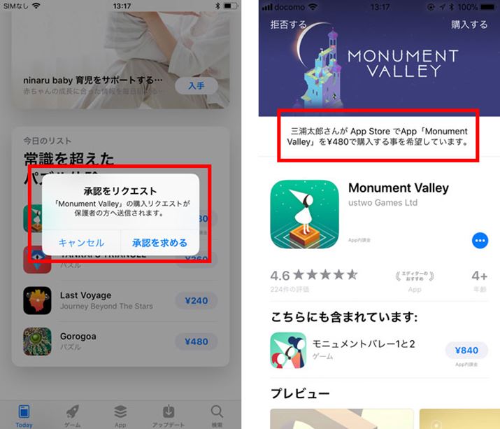 「承認と購入のリクエスト」の例。左が子どものiPhone、右が親のiPhone。親が承認しないと、アプリは購入できない。子どもにとって不適切なアプリのダウンロードを未然に防げる機能だ
